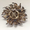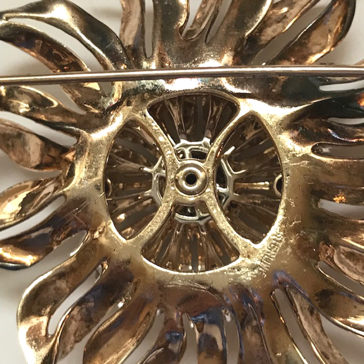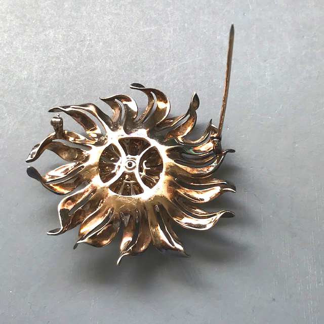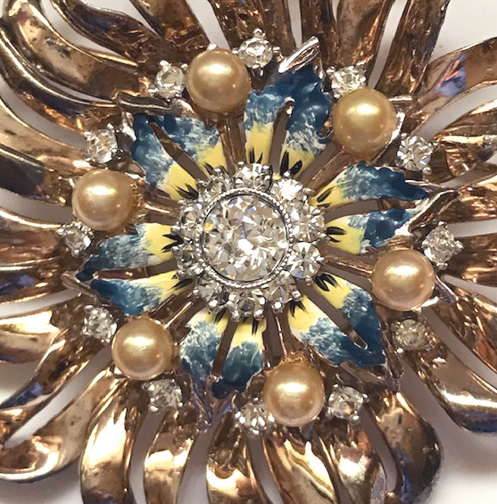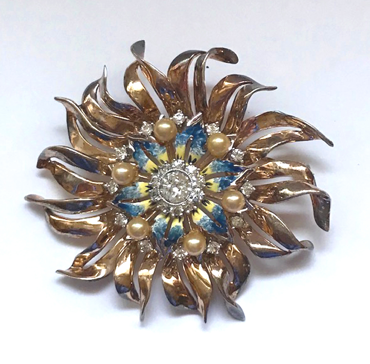 Description DUJAY sparkling open flower brooch with a brilliant clear rhinestone center surrounded by a halo of smaller clear rhinestones and glass pearls, then dainty leaves enameled in blue, black and yellow with more clear rhinestones set in gold plated sterling silver petals or leaves. It is not signed on the back, the only mark is the word "sterling", but has the typical DuJay features, like the pin back that opens only 45 degrees (see the second to last photo). This was made in the 1940s, and it is 2-1/2" wide.