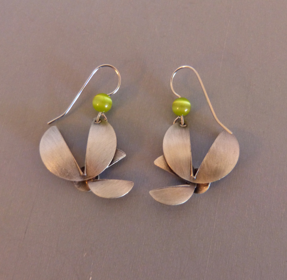 EARRINGS in matte silver metal with green beads and glass cabochonProduct #39508 All items in excellent vintage condition unless otherwise noted.