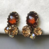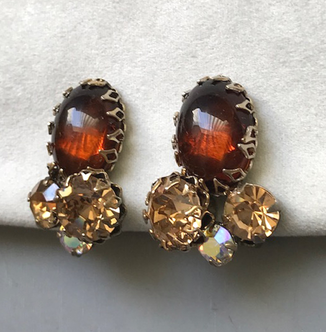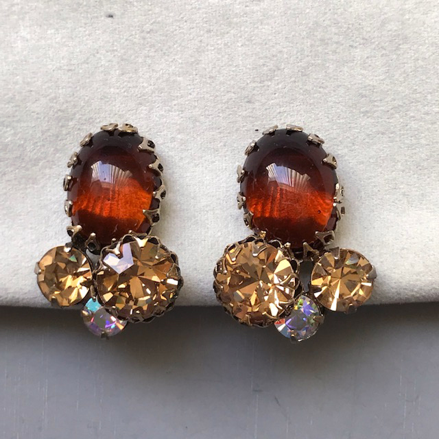 EARRINGS with caramel brown glass cabochons, tan rhinestones and aurora borealisProduct #39563 All items in excellent vintage condition unless otherwise noted.