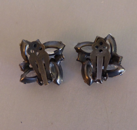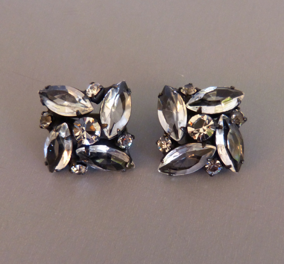 EARRINGS with clear unfoiled marquis-shaped rhinestones set in a black japanned setting