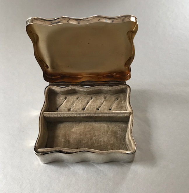Description EDWARDIAN era A&J Zimmerman sterling silver fitted ring box hallmarked for the year 1912, 3-1/2" by 3" by 1-1/8" deep.