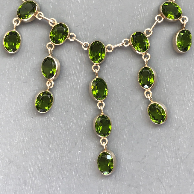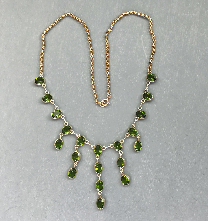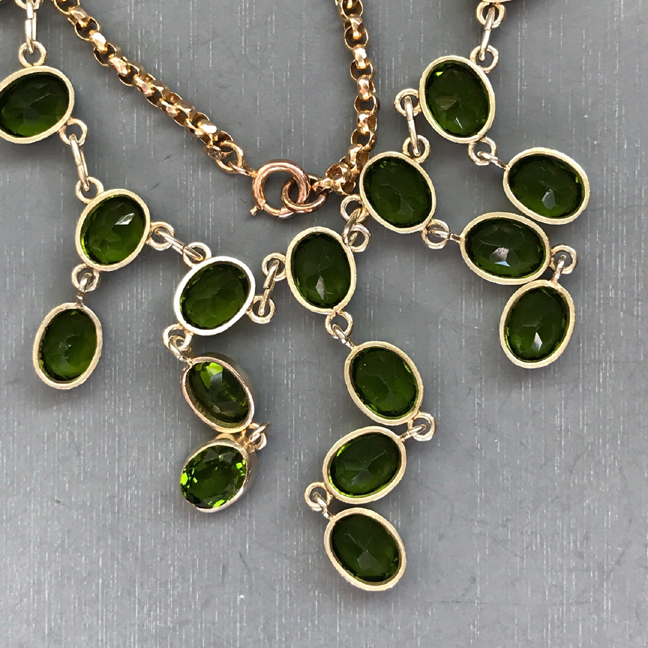 EDWARDIAN graceful fringe necklace in 10 karat yellow gold and green faceted pastesView View View View Product #38363 All items in excellent vintage condition unless otherwise noted.