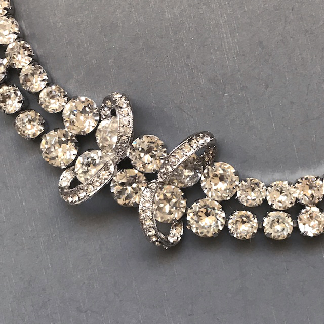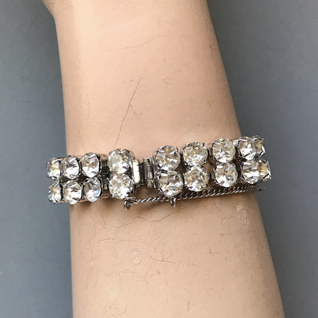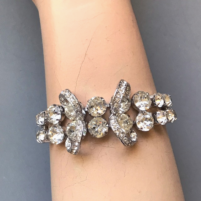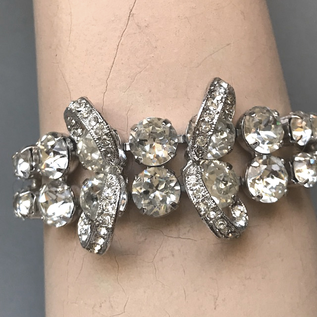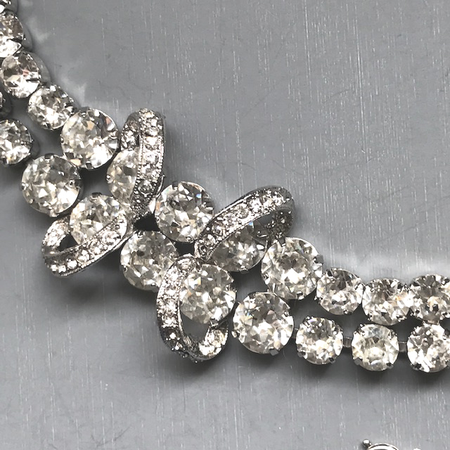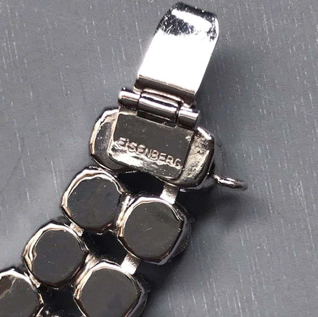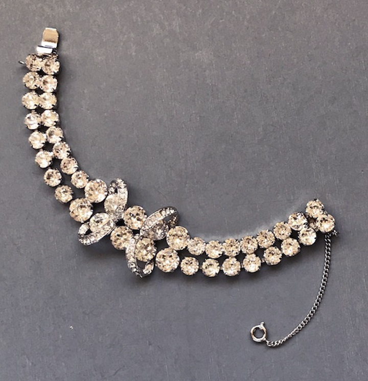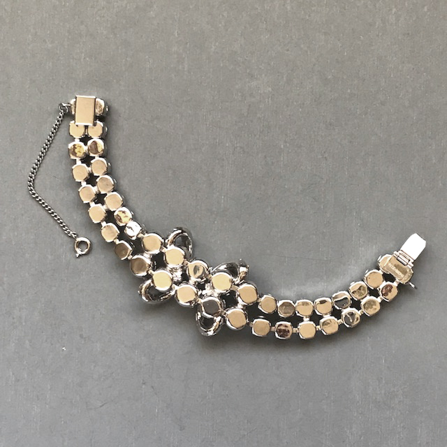 Description EISENBERG dazzling clear rhinestones bow bracelet in a silver colored rhodium plated setting and with it's safety chain, 7" by 1", signed "EISENBERG" on the back, View View View View View View View View