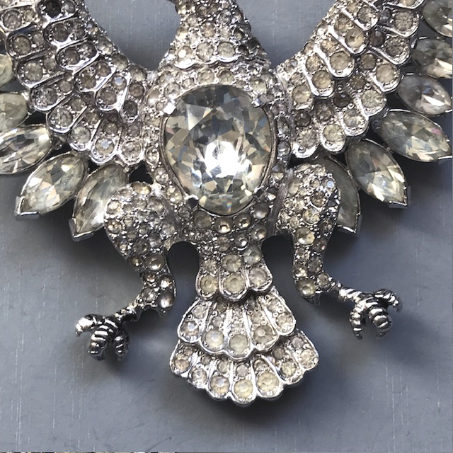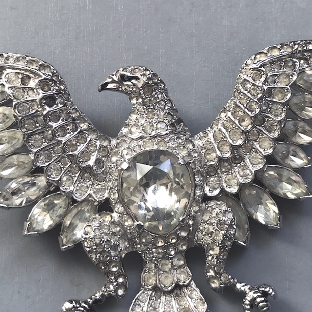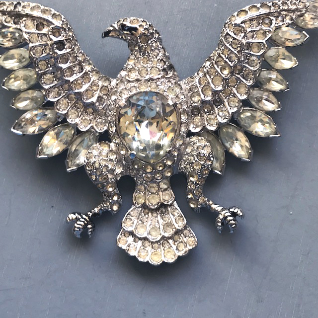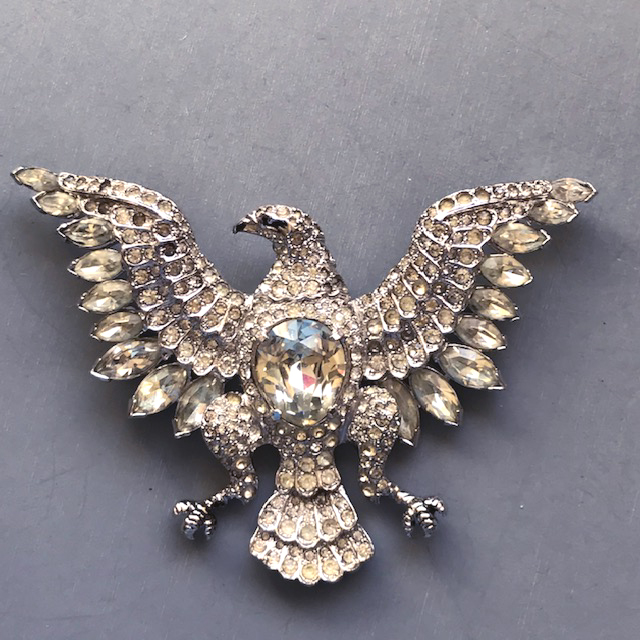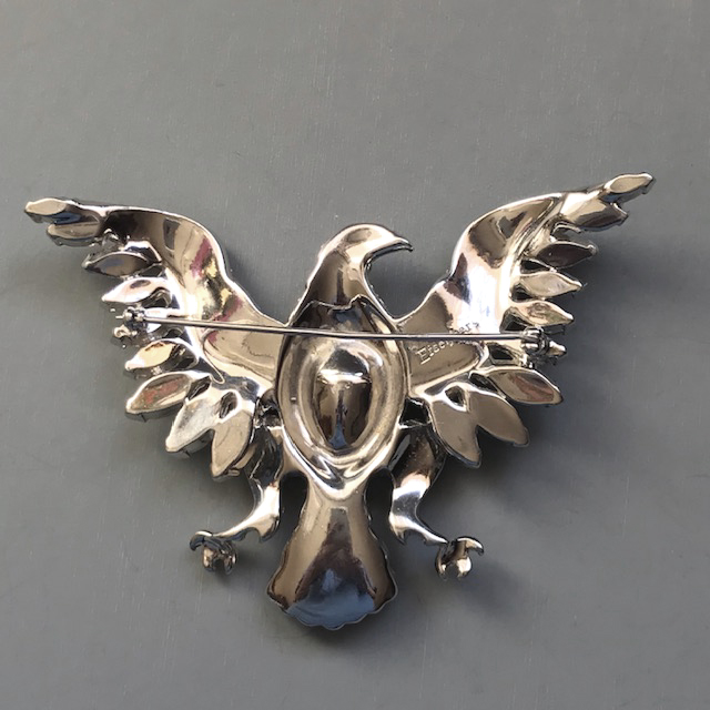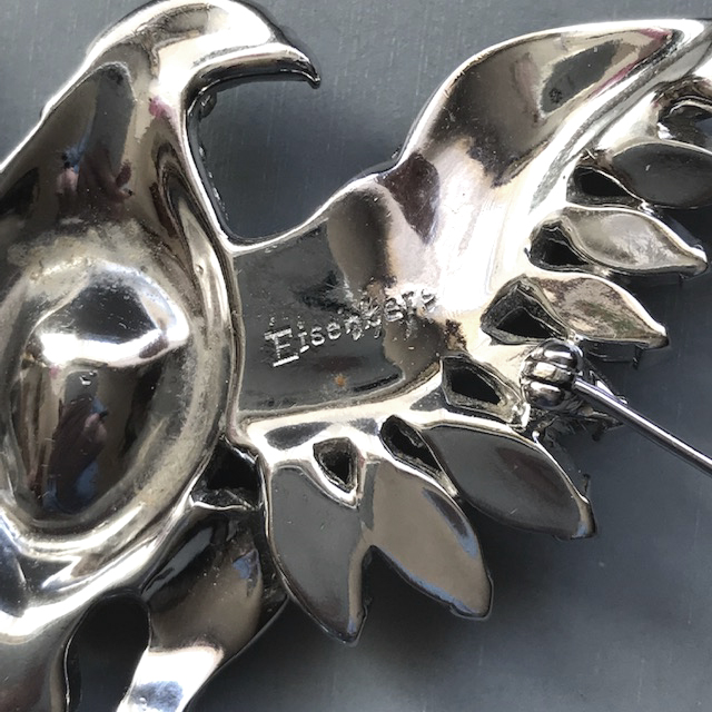 Description EISENBERG large eagle brooch with brilliant clear rhinestones in a silver tone setting, a dramatic brooch for sure. It is the larger size at 4" by 2-5/8" and it is in wonderful vintage condition with only a touch of black missing from his beak and eye. It was made in 1951, as jpg of the the Maidenform bra advertisement HERE shows. In 1953, actress Thelma Ritter wore it as a necklace in her movie "Titanic", shown in this jpg HERE. This is a bird that really got around! Shown HERE just for fun is a photo of Ruth Kamke, designer of the eagle and many other wonderful Eisenberg pieces. In front of her are trays holding many of her designs including the eagle towards the bottom left of the photo. View View View View Product #42692
