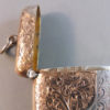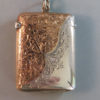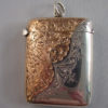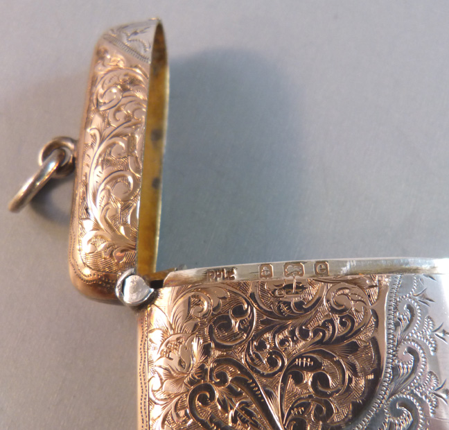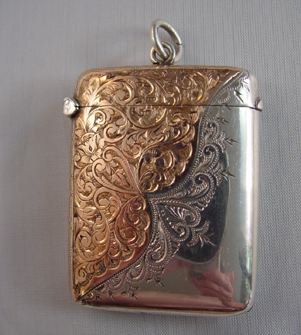 Description ENGLISH vesta in sterling silver and 9 carat rose gold, a match safe with lovely engraved designs, hallmarked for Birmingham 1904.  It weighs about  1-5/8" by 2".  The workmanship is gorgeous and it has a loop at the top so that it can be added to a chatelaine or worn as a pendant.