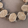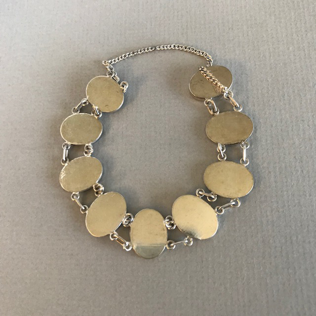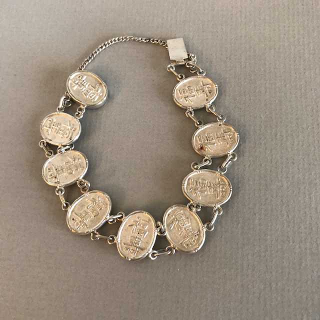 DescriptionSTERLING Asian Chinese sterling bracelet, marked on the back "sterling" and with Chinese writing on each oval disk, and it has a safety chain.