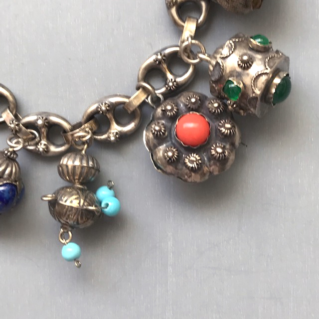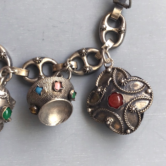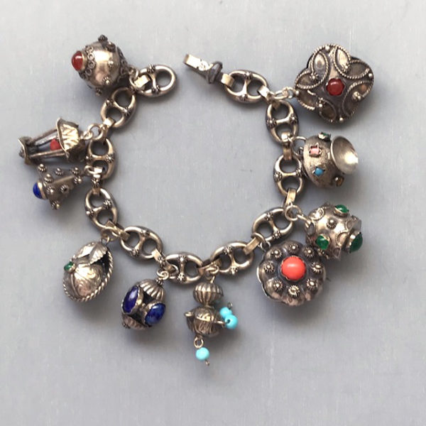 ETRUSCAN REVIVAL 800/1000 sterling charm bracelet with ten different charmsProduct #41821 All items in excellent vintage condition unless otherwise noted.
