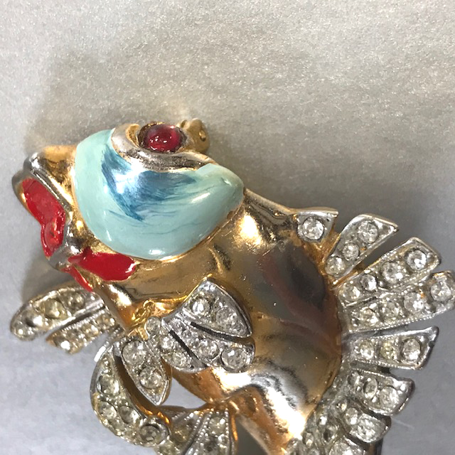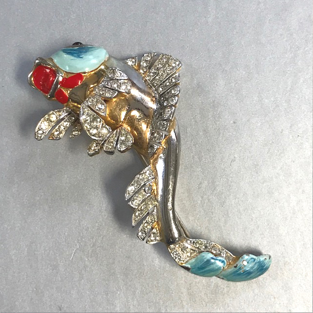 The swirling design is absolutely wonderful! It's not signed and while from the front it looks like a DeRosa, but the back doesn't give me a clue. I will just call it an unsigned fun figural fish brooch, circa 1940s.