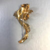 Description FISH enameled fish brooch which I thought at first was by DeRosa. It has a wonderful two-tone aqua enameled face and tail and red lips with clear rhinestone accents all set into gold plated metal, 3" by 1-5/8".