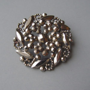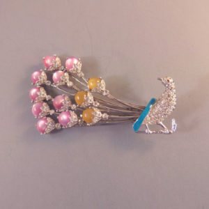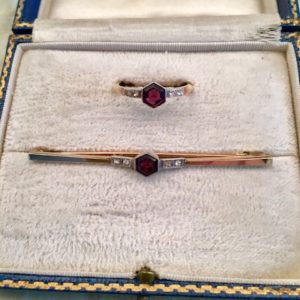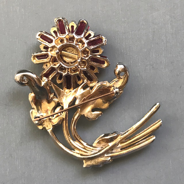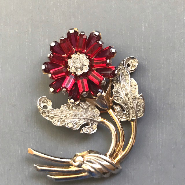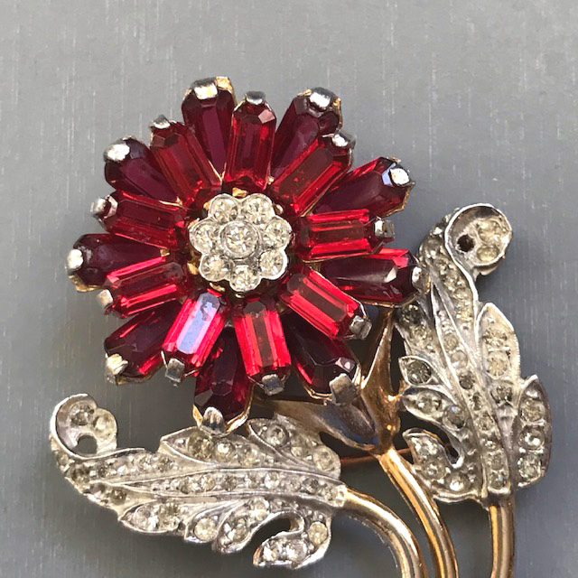 FLOWER and leaves brooch with two layers of brilliant red unfoiled and prong set baguette rhinestonesProduct #42628 All items in excellent vintage condition unless otherwise noted.