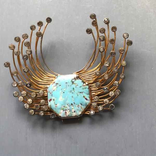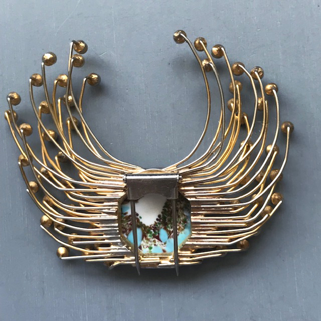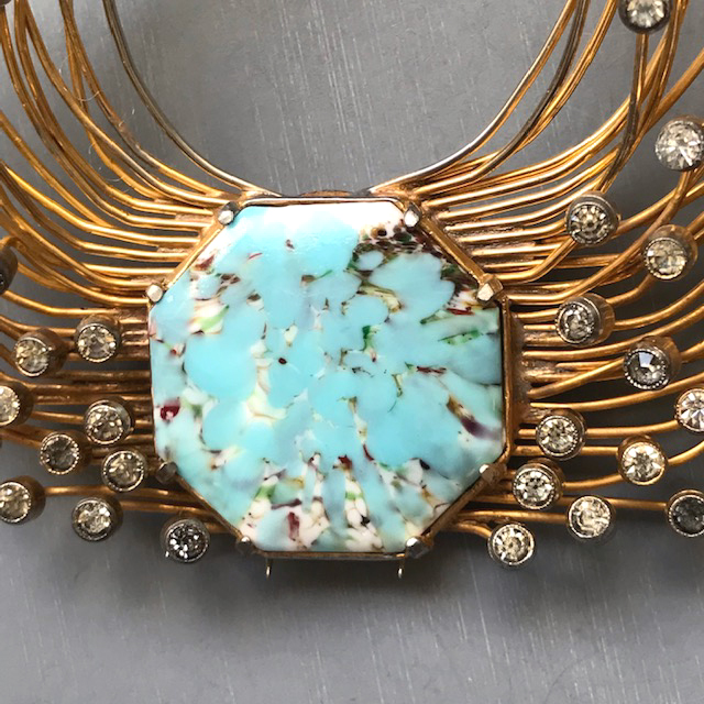 Description FRENCH fur clip with a hexagon shaped ceramic center piece in aqua, brown and white and a spray of clear rhinestone on wires above it, amazingly like a spray of stars!  It was the seller who told me it is a French piece, and it is 3-1/4" by 3".  View  View
