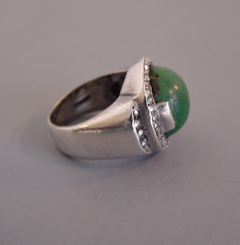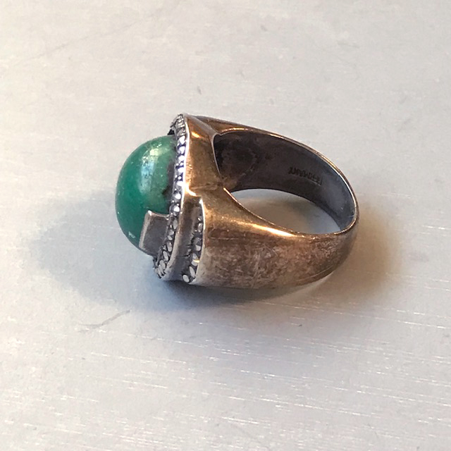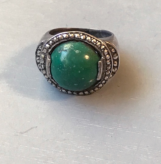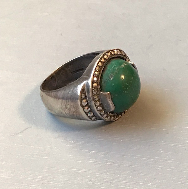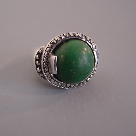GERMANY sterling green stone cabochon marcasite ringView Product #N35469 All items in excellent vintage condition unless otherwise noted.