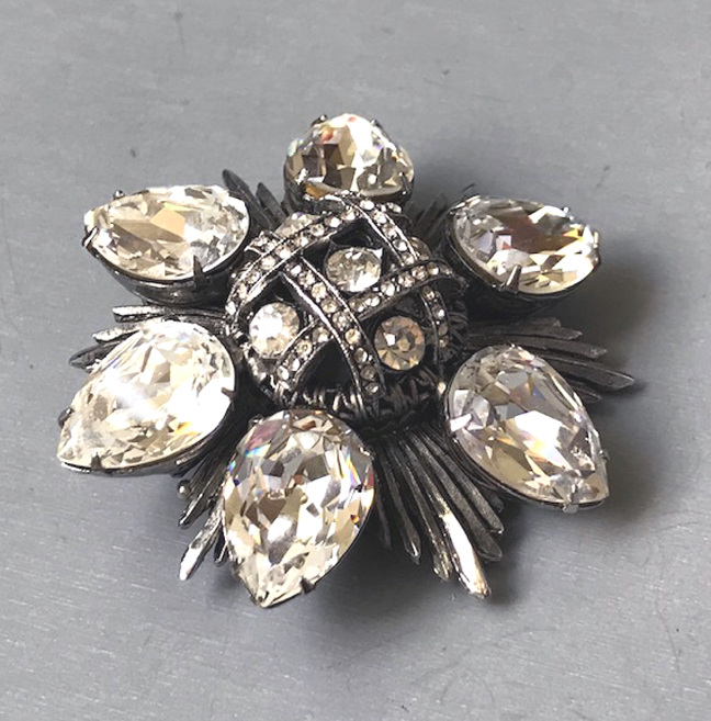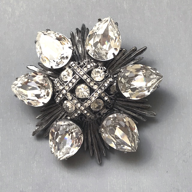 GRAZIANO brilliantly clear rhinestone starburst brooch with a silver tone setting
