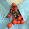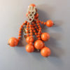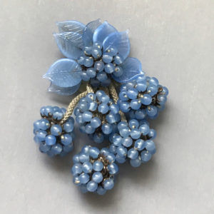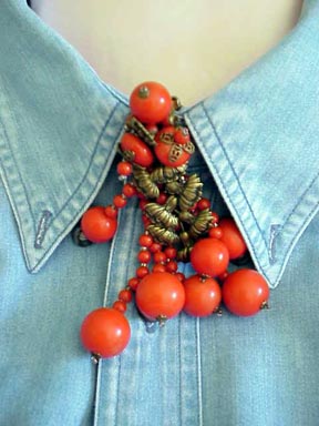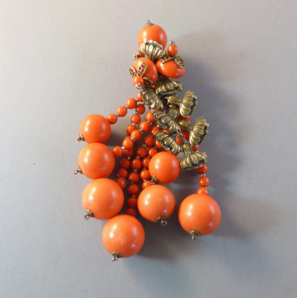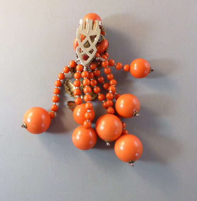 Description HASKELL Frank Hess early dress clip with carrot orange colored opaque round and flattened glass beads and metal floral findings, circa 1940.
