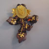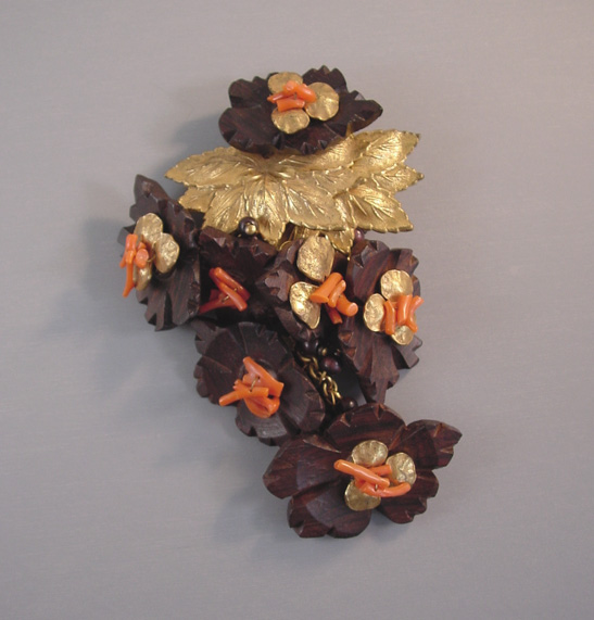 DescriptionMIRIAM HASKELL by Frank Hess dress clip with carved wood flowers suspended by gold tone chains, orange stick coral and gold tone metal leaves, 4-5/8". A Frank Hess design for Miriam Haskell, it is unsigned as was typical for this era, circa 1940, and it is in excellent condition. Hess did some of my all time favorite Haskell pieces, and this a great example! View Product #H37627