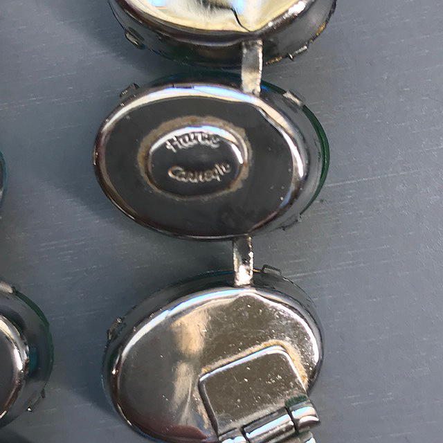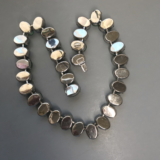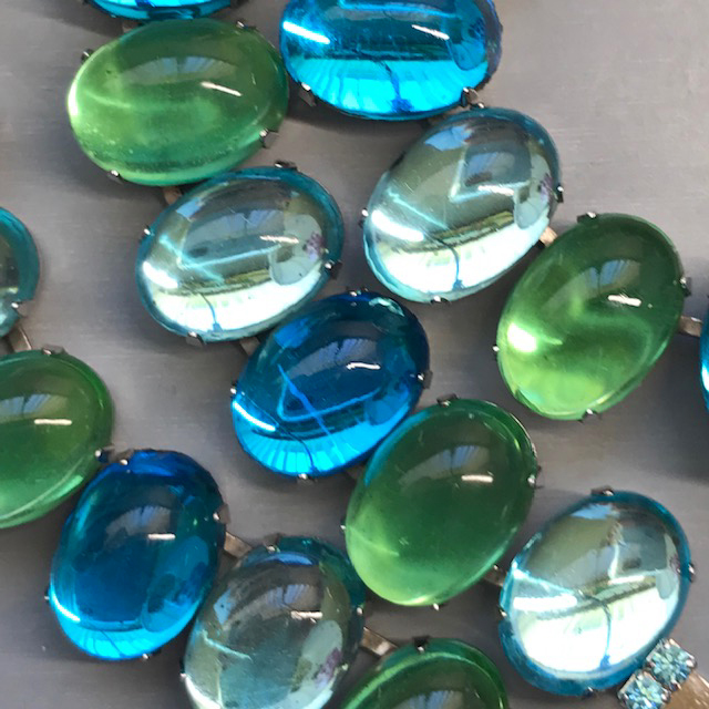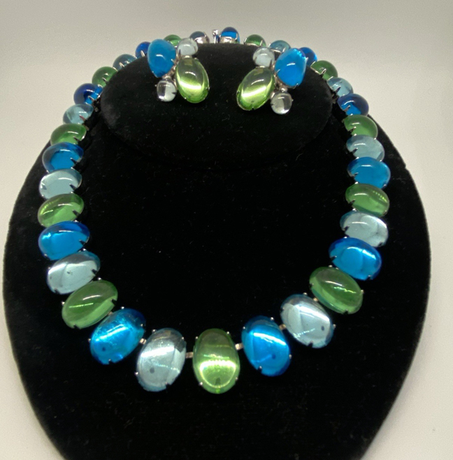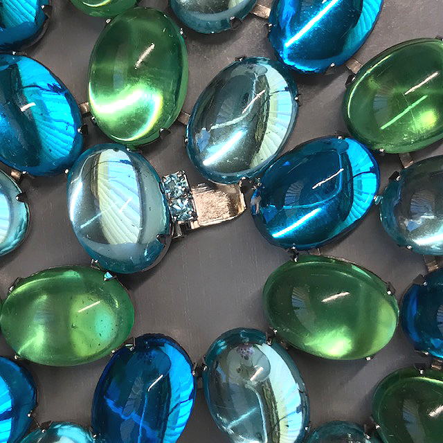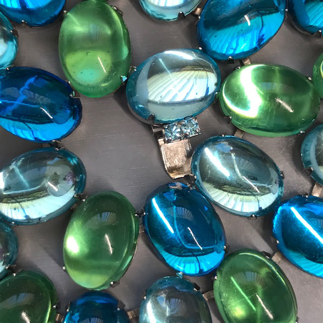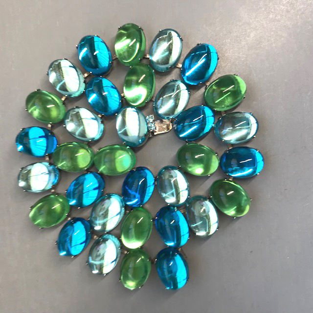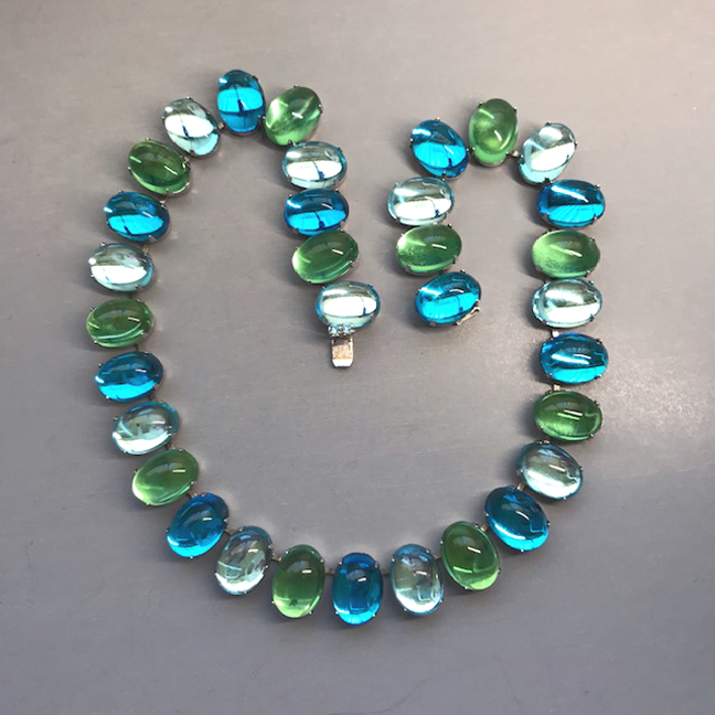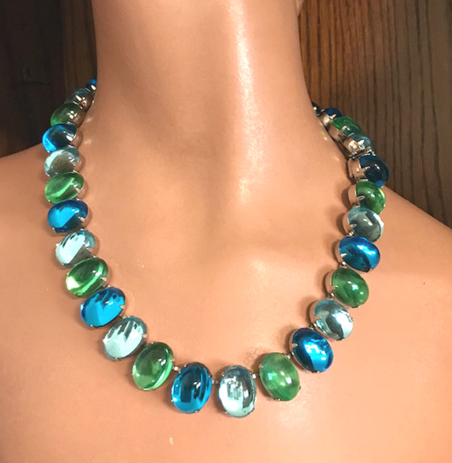 HATTIE CARNEGIE aqua and green glass cabochons necklace in a silver tone settingProduct #43013 All items in excellent vintage condition unless otherwise noted.