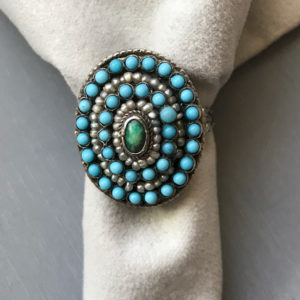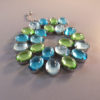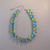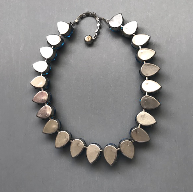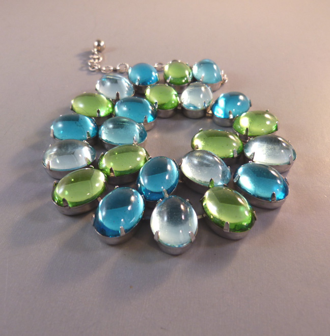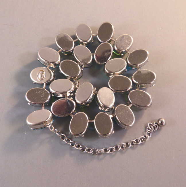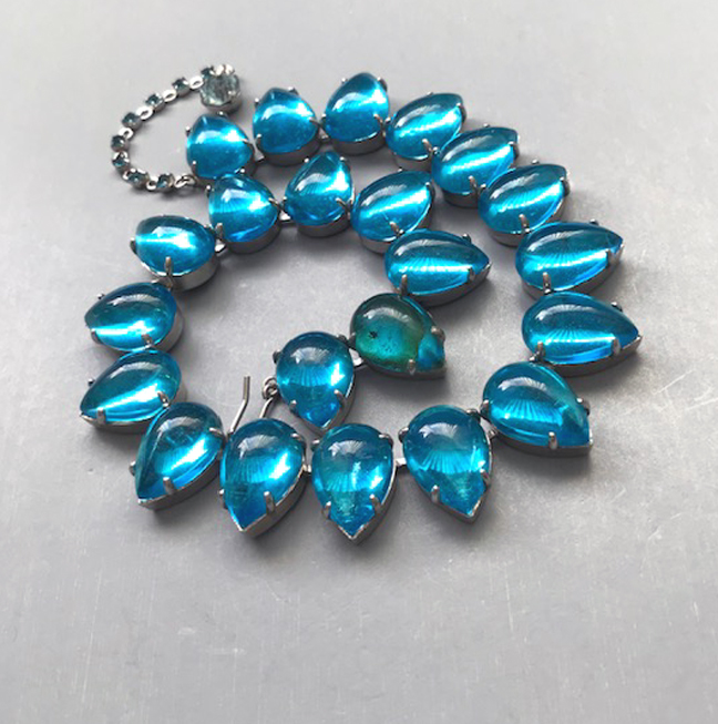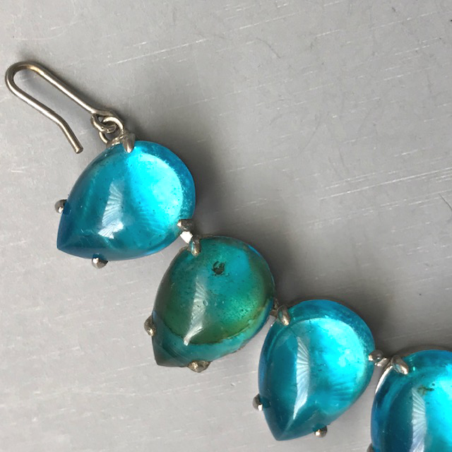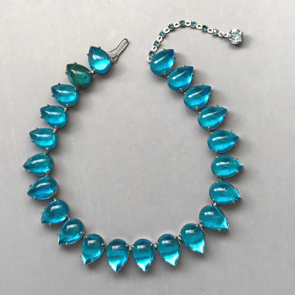 HATTIE CARNEGIE attributed peacock aqua color teardrop shaped cabochons necklace that literally glows with lightIt is a wearable length 14-15" long and 5/8" wide. One stone at the back of the necklace is slightly discolored, but it cannot be seen when the necklace is worn. The Carnegie signed necklace we had can be seen here and here and the signature here. The last three photos show the signed Carnegie necklace we had at one time so that you can make the comparison yourself. View View View Product #42196 All items in excellent vintage condition unless otherwise noted.