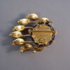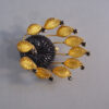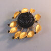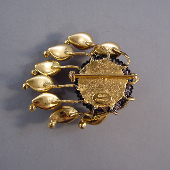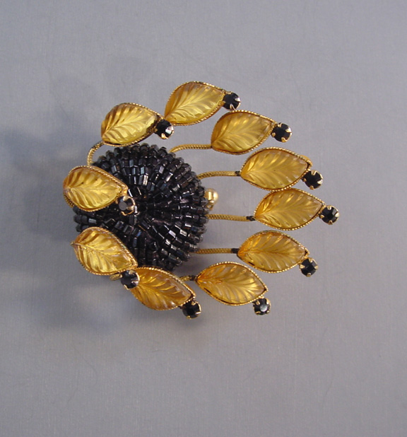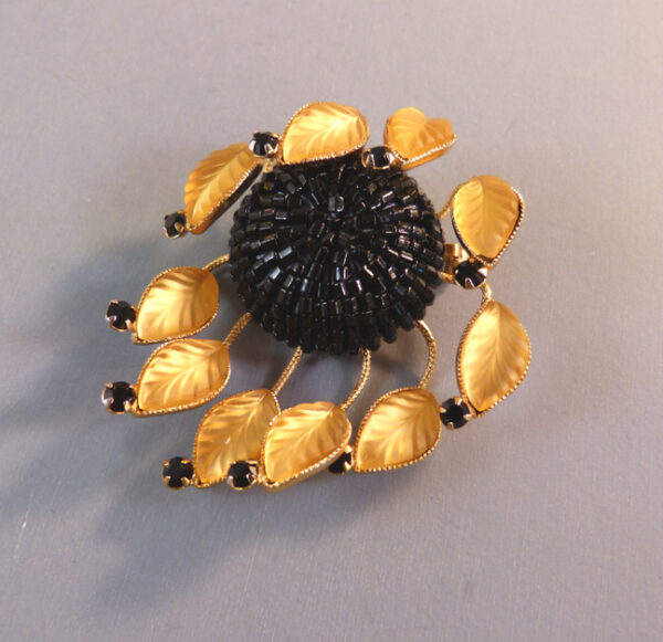 Description HATTIE CARNEGIE brooch with luminescent pressed golden glass frosted leaves that surround a center of black glass bugle beads, all in a gold plated setting, 2-1/3" by 2". This has the "Hattie Carnegie" signature on the back. Similar molded glass leaves were also used by Hobe and Schreiner during this time period of the 1960s, as well as in pieces with no signature. I have a real fondness for their glowing beauty. View View Product #38229
