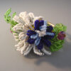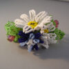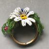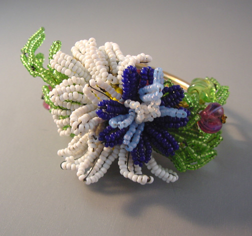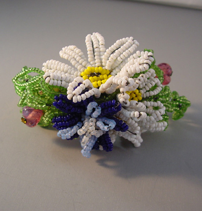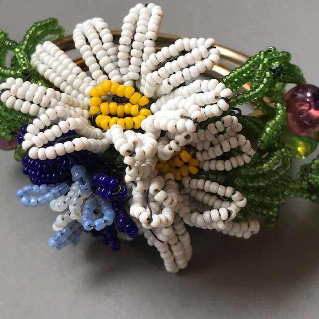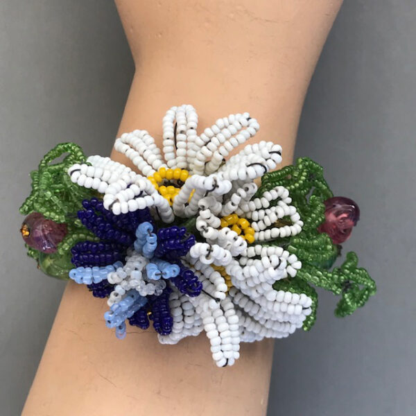 HATTIE CARNEGIE double hinged bracelet with a gorgeous floral bouquet of white, green and blue glass seed bead flowers and rose colored transparent glass beads