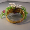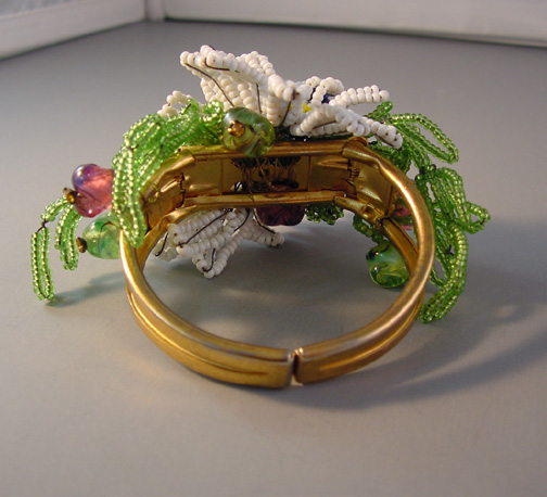 Description HATTIE CARNEGIE double hinged bracelet with a gorgeous floral bouquet of white, green and blue glass seed bead flowers and rose colored transparent glass beads, all in a gold plated setting, 6-1/8" wearable size and adjustable and with a 2" wide front.