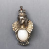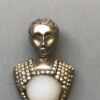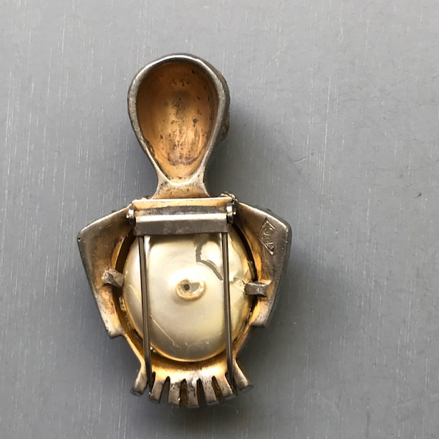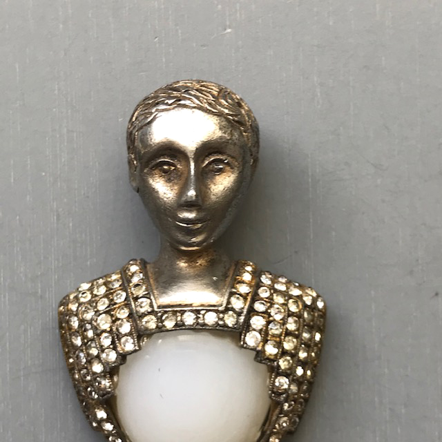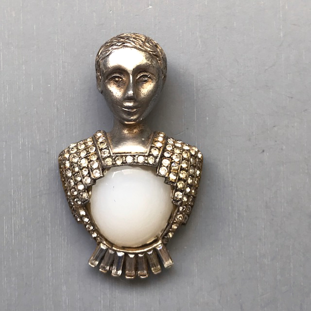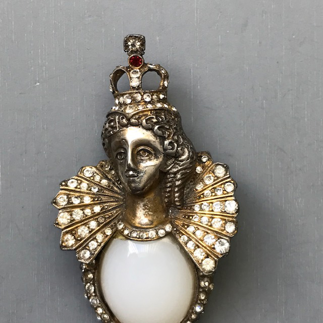 HC CARNEGIE royal Emperor and Empress king and queen fur clips with milk glass bellies and clear rhinestone accentsThese are such a great couple and can be worn together or one at a time. The pearl coating on the front of the bellies is no longer there, there is just the original milk glass. Milk glass is pretty itself so not everyone would notice, but it is something I felt it fair to mention and the price is adjusted accordingly. There is a similar piece, a wax seal, in the fine jewelry section of the Metropolitan Museum and on their web site HERE. Theirs is from the 17th-18th century and made of carat gold, platinum and diamonds. Ours is a piece of costume jewelry, of course, but I bet the Metropolitan's seal was Carnegie's inspiration for her wonderful and unusual set. NOTE: I have seen an advertisement now dating these to 1942 and calling them the "Emperor" pin and "Empress Elizabeth". Thanks to Liz Gross for this information. View View View View View View View View View Product #42004 All items in excellent vintage condition unless otherwise noted.
