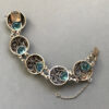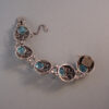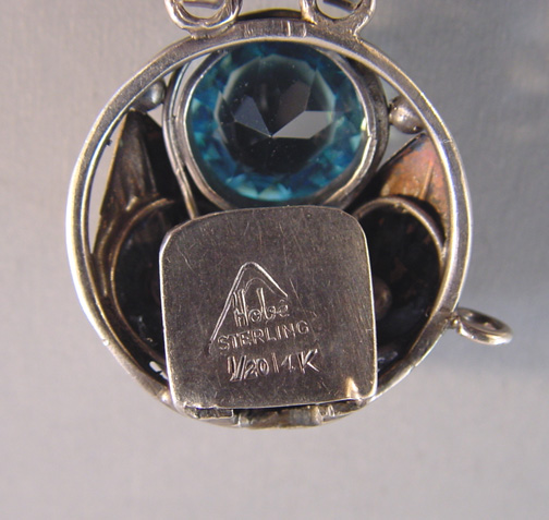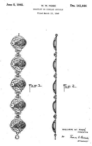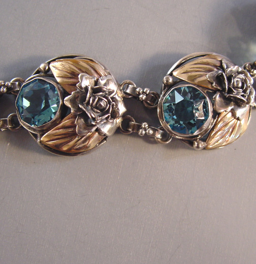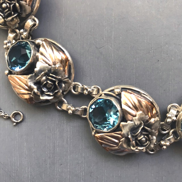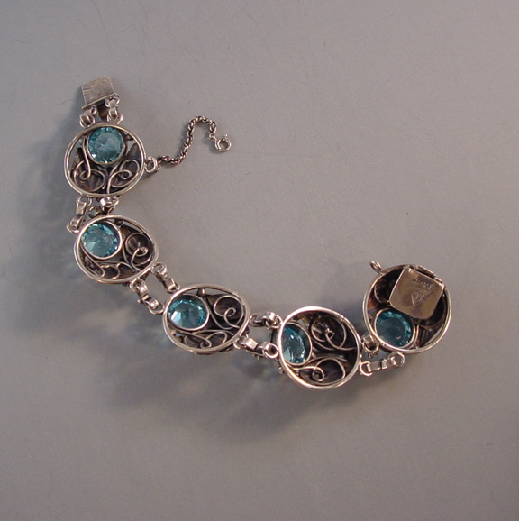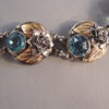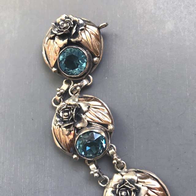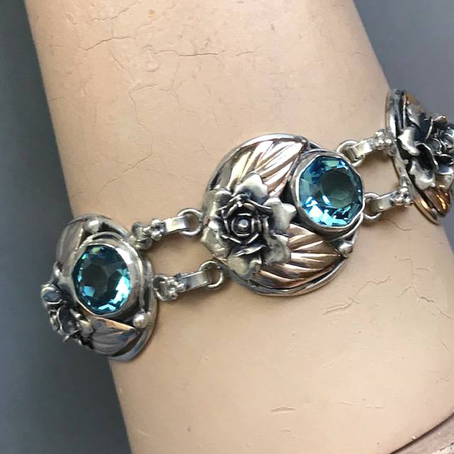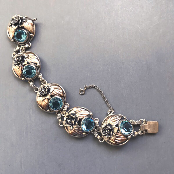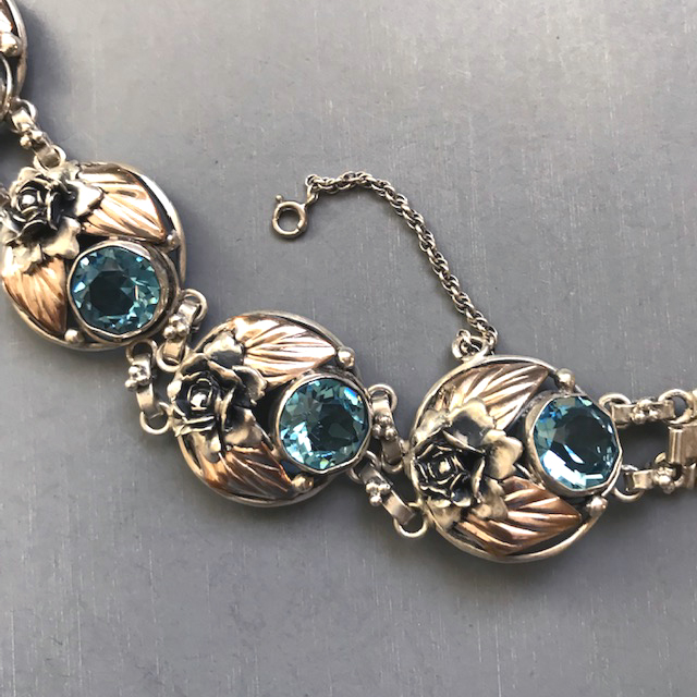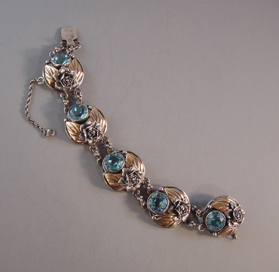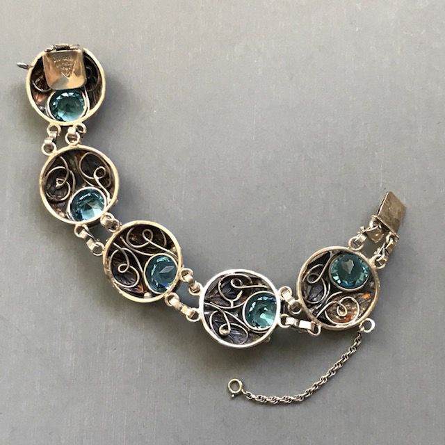 DescriptionHOBE bracelet with aqua rhinestones set in sterling silver and with accents of gold plating, the workmanship is excellent, all done by hand. It still has it's safety chain and it is 7" by 1". Made in the mid-1940s, it is signed on the back of the clasp "Hobe sterling 1/20th of 14k" in a triangle. Patent number 141,444 shows the design of this bracelet. NOTE that there is one rhinestone with a chip on one side, so hard to see that I cannot get a photo of it, but this is priced accordingly. Otherwise it is in very good condition with no other flaws at all. View View View View Product #38232