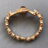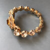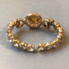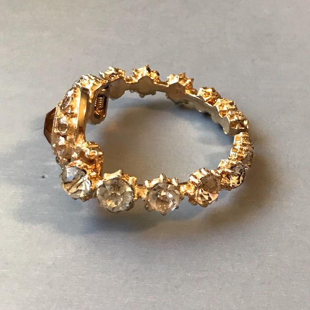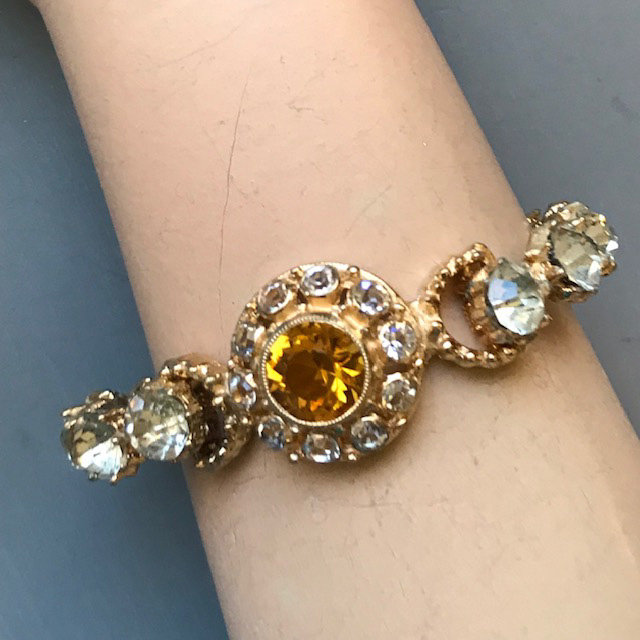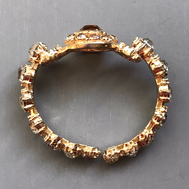 DescriptionHOBE bracelet with brilliant honey topaz color and clear rhinestones, snap-back hinges on two sides and in a gold plated setting. It is 5-3/4" around the inside and the front circle is 7/8" across. It is hinged on two sides so it opens for easy wearing and it will fit a wrist up to 6" or a bit more.