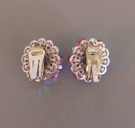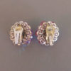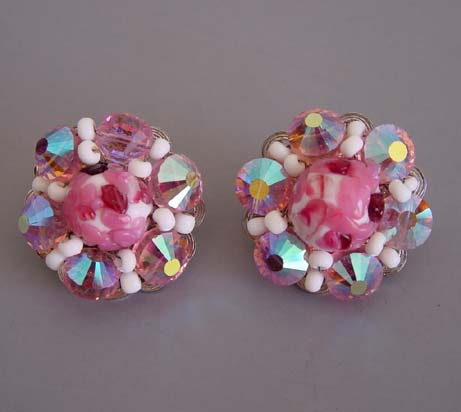 Description HOBE earrings of pink art glass, aurora borealis faceted glass crystals and white beads, cushioned clip backs that are 1" across and marked "Hobe" on the back. View Product #16644