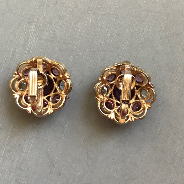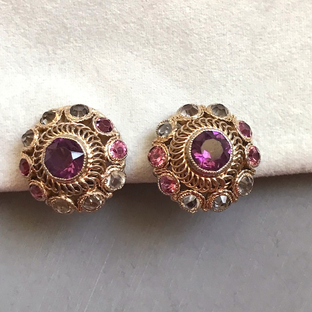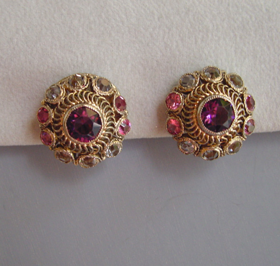 HOBE earrings with unfoiled faceted rhinestones in purple, pink and clear, all set in sterling gilt hand made wire work filigreeView View View Product #38674 All items in excellent vintage condition unless otherwise noted.