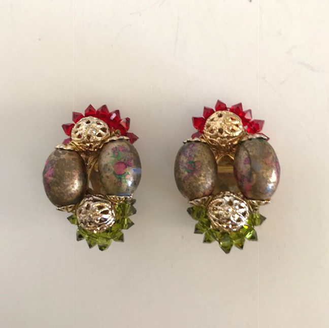 DescriptionHOBE earrings with wonderful red and green faceted glass beads, gold filigree balls and a bead with flowers between, marked on the back "Hobe", 1-1/3" clip backs. Just lovely and from the 1960s. View Product #40615