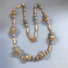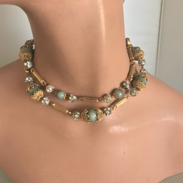 HOBE long sage green glass beads necklace and clip back earringsThe beads are just gorgeous and the gold tone chains are perfect with them! The necklace is long enough to wear in one long strand or doubled on most necks. Although the necklace is not marked, it is a perfect match to the earrings, which are marked "Hobe" on the back. View View View View View Product #40538 All items in excellent vintage condition unless otherwise noted.