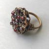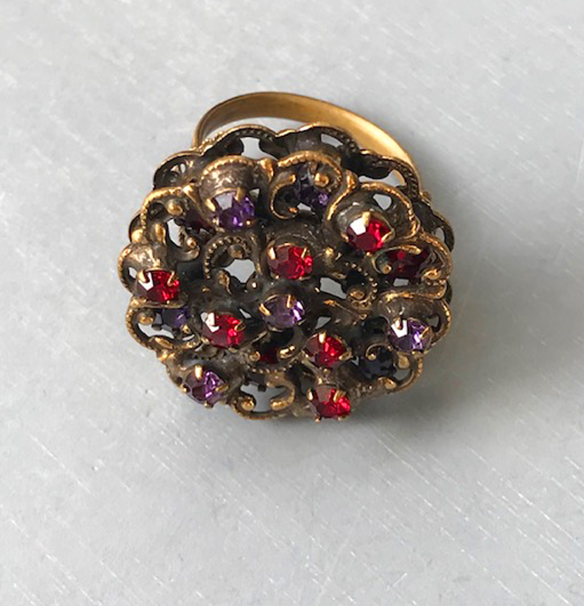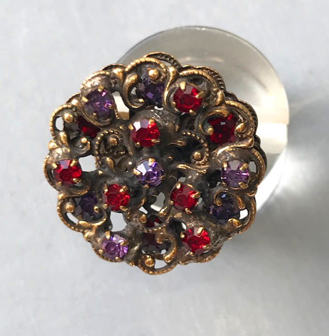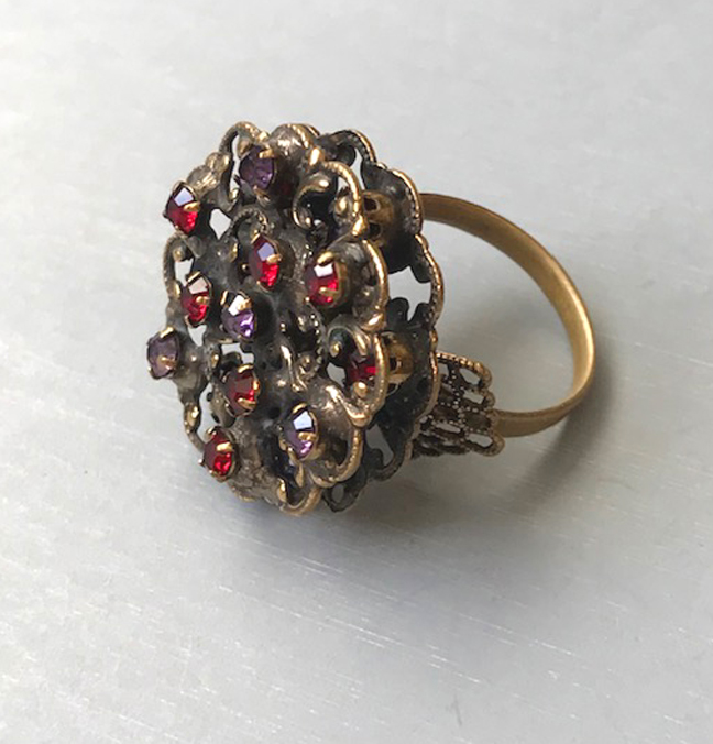 HOBE RING with red and purple rhinestones in an antiqued gold tone metal settingProduct #42186 All items in excellent vintage condition unless otherwise noted.