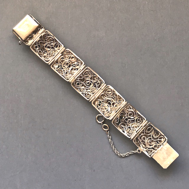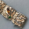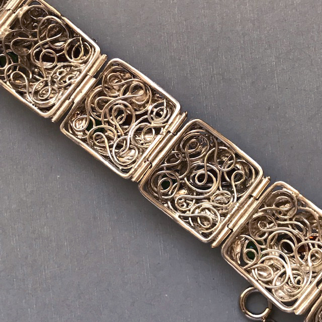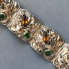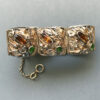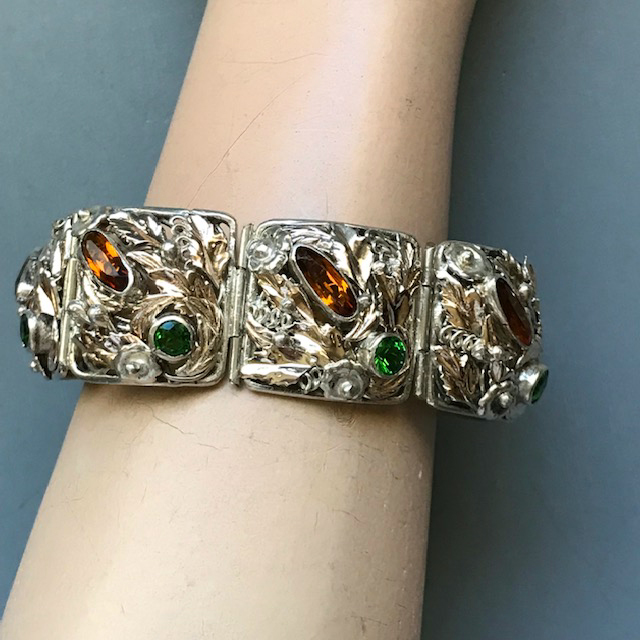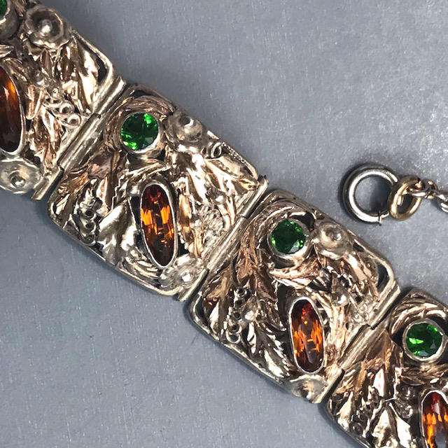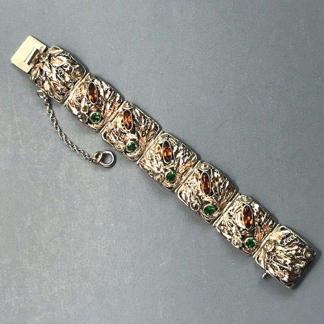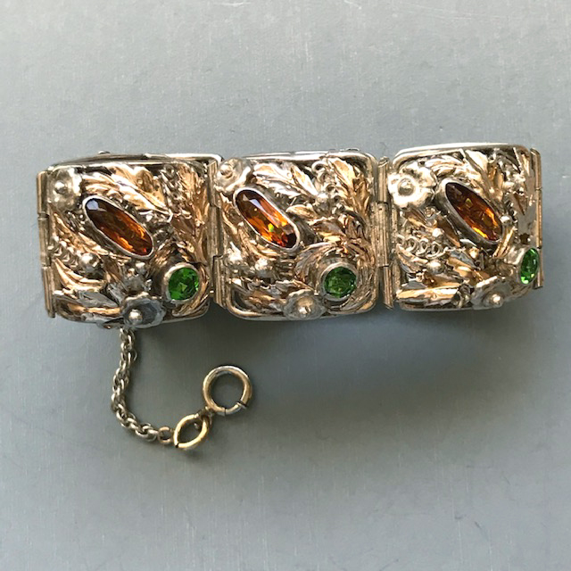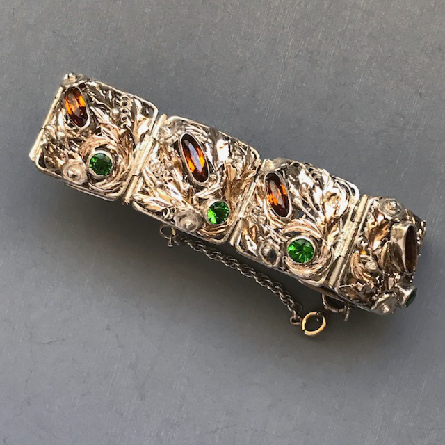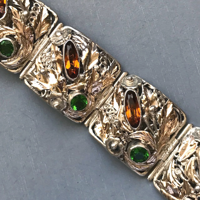 HOBE sterling silver bracelet with topaz and green color rhinestones hand wrought setting of flowers, leaves and coilsView View View View View View View View View View View Product #42689 All items in excellent vintage condition unless otherwise noted.