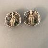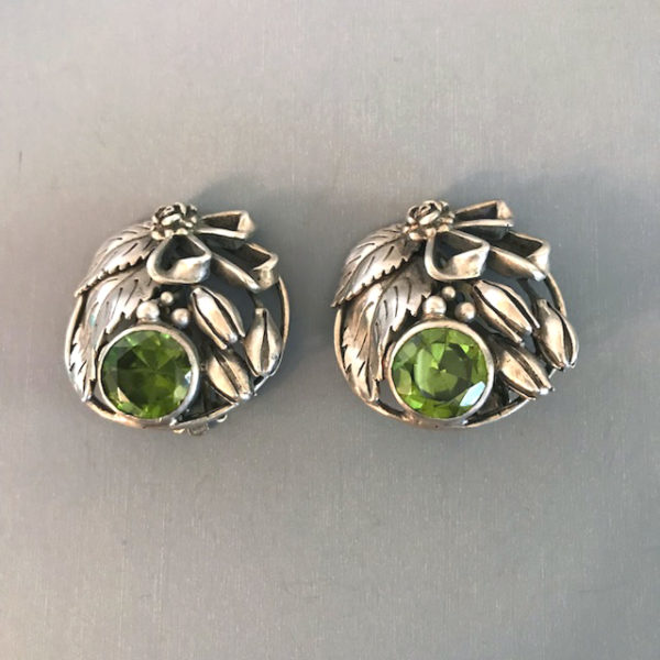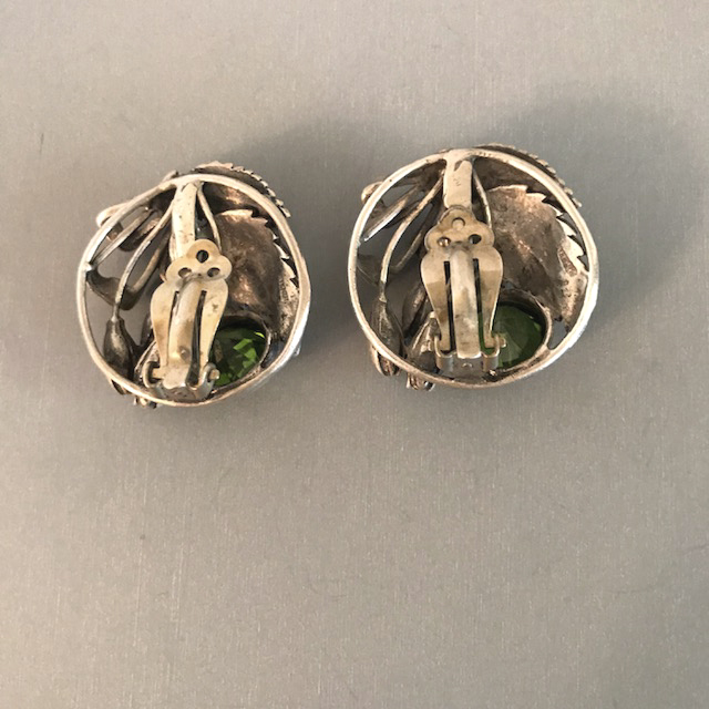 Description HOBE sterling silver clip back earrings with unusual faceted unfoiled synthetic green spinel triplets and hand wrought flowers, buds, ribbons and leaves, 1-1/4" clip backs. Of special interest are the green synthetic spinel triplets, not often seen in costume jewelry. Made in the 1940s, these are lovely and in excellent vintage condition and while the are attributed to Hobe, they are not signed.