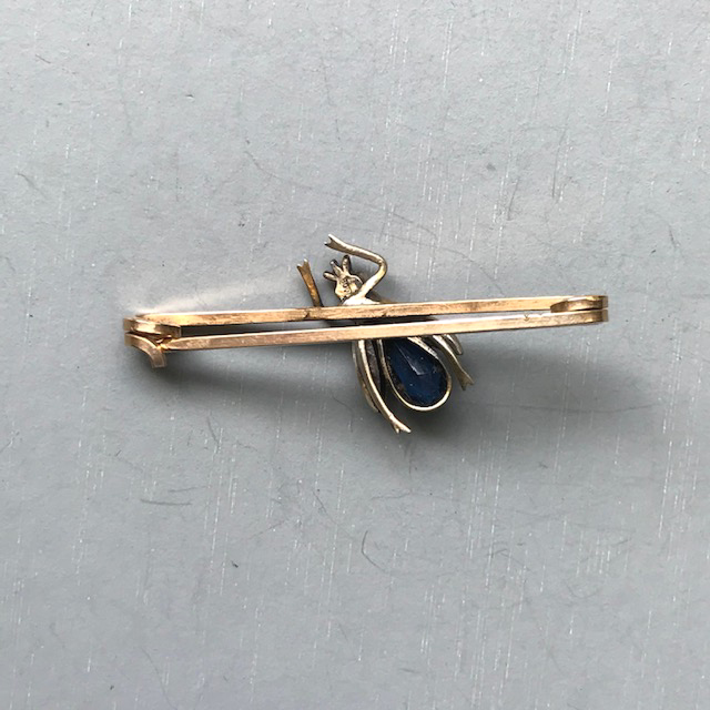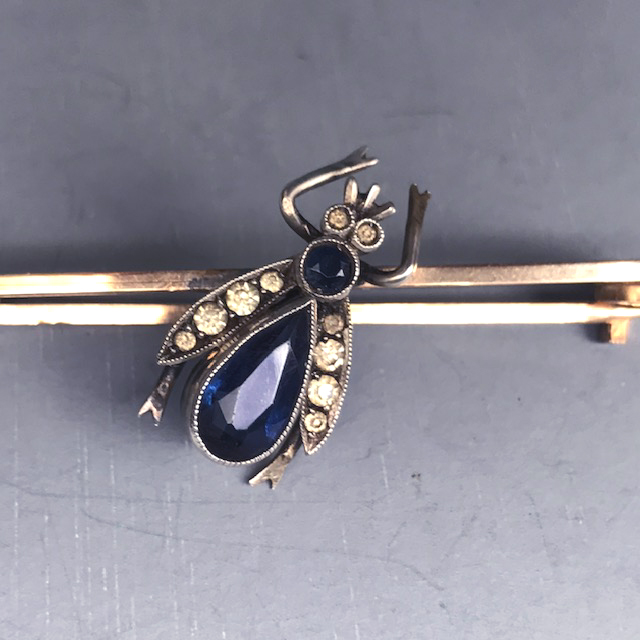 Description INSECT blue and clear paste rhinestones bug or fly on a gold washed sterling silver bar pin, 1-7/8" by 7/8". View View Product #37861