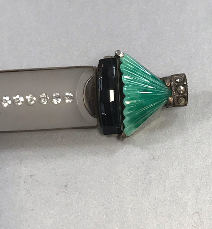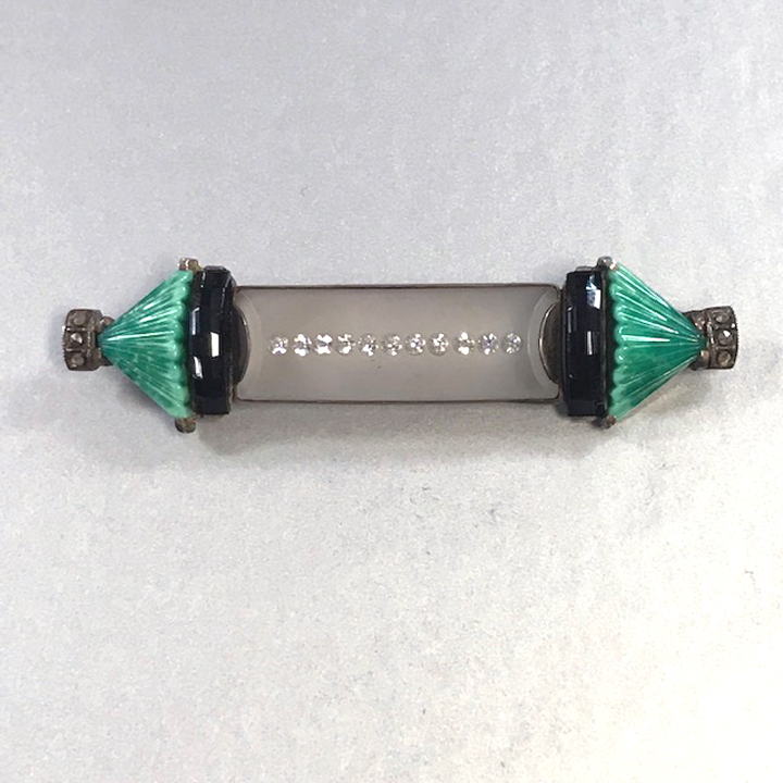 According to Ginger Moro’s wonderful book, "European Designer Jewelry" on page 233, Cohen found vintage molded glass elements in Paris and combined them with modern silver, onyx, marcasites, and chrysoprase to fashion his Deco inspired jewelry. According to Cohen, he was also inspired by the Amsterdam School designs from earlier in the 20th Century. View View View View Product #41662