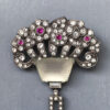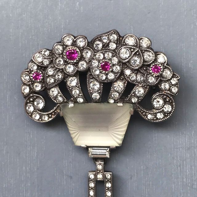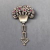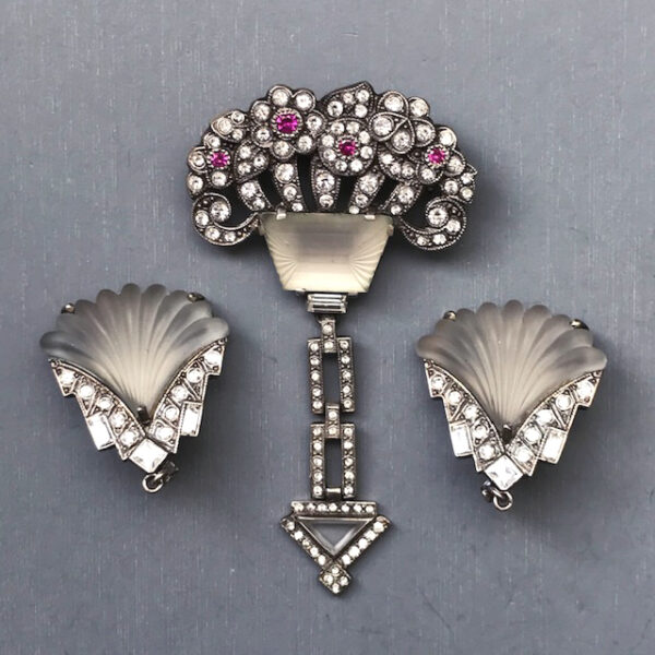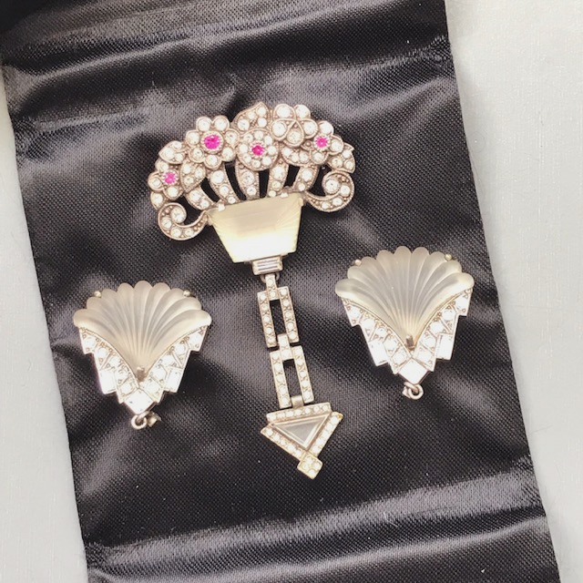 JAC Jorges Cohen basket brooch and earrings- sterling silver brooch with a frosted glass or rock crystal stone, a frosted rock crystal triangle, synthetic rubies and Swarovski crystals