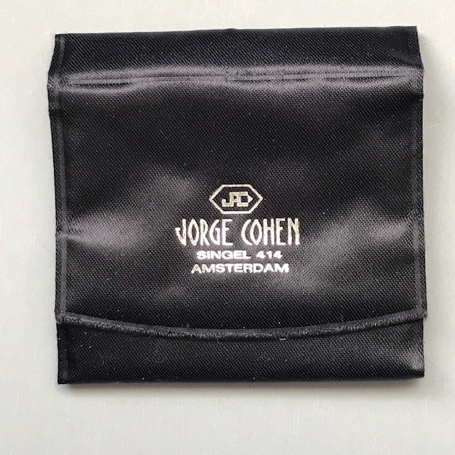 DescriptionJAC Jorges Cohen basket brooch and earrings- sterling silver brooch with a frosted glass or rock crystal stone, a frosted rock crystal triangle, synthetic rubies and Swarovski crystals. The brooch is a total length of 2-3/4" and it is 1-1/2" wide. The clip back earrings are 1-1/3" by 1'. All three pieces have his mark on the back. Also included is a black satin pouch with his emblem on the front. Other pieces by this maker can be seen in the Christie’s Elizabeth Taylor Auction in December 2011, HERE. Mr Cohen was based in Amsterdam, but has since passed away. He was born in 1941 and died in 1993.