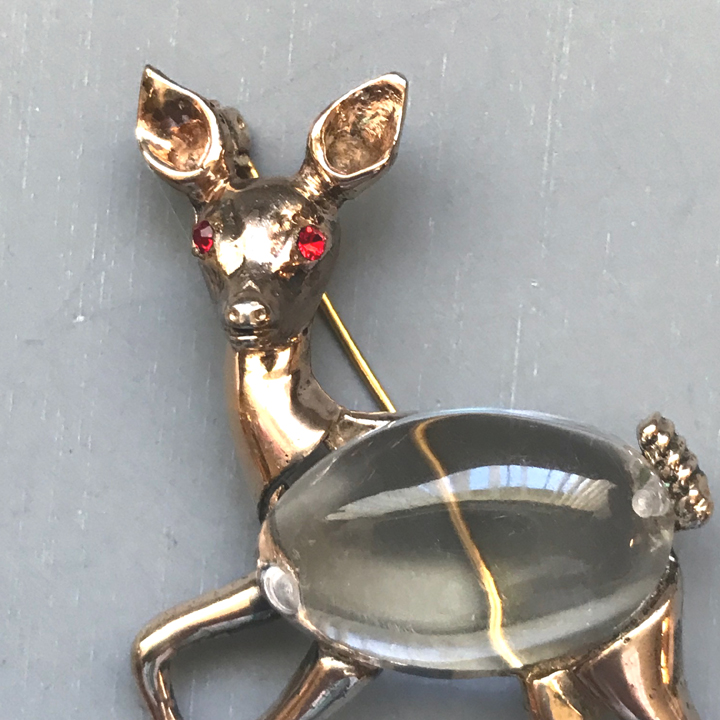 Description JELLY BELLY deer brooch in an attentive and graceful pose.  The belly is clear Lucite, the body is gold plated sterling silver and the eyes are red rhinestones.  It is marked only "sterling" and it is 2-5/8" by 2" in size.  This wonderful brooch can be seen in the book "American Costume Jewelry Art and Industry 1935-1950" on page 224.  It is also in "Warman's Costume Jewelry" by Pam Wiggins, 2014 Edition on page 45.  Storybook Bambi couldn't be happier to be styled as this brooch! View  View  View
