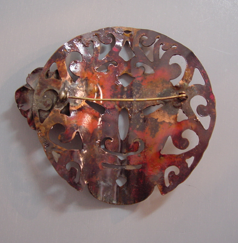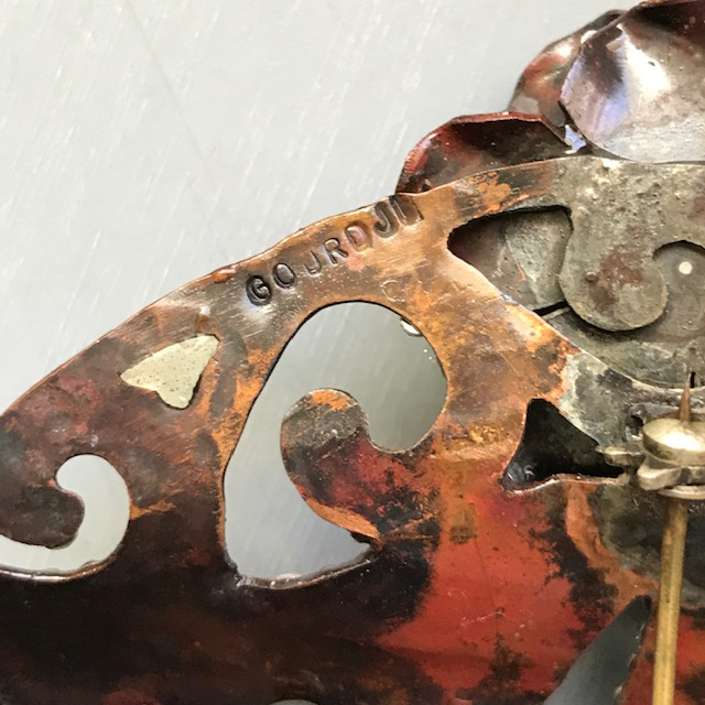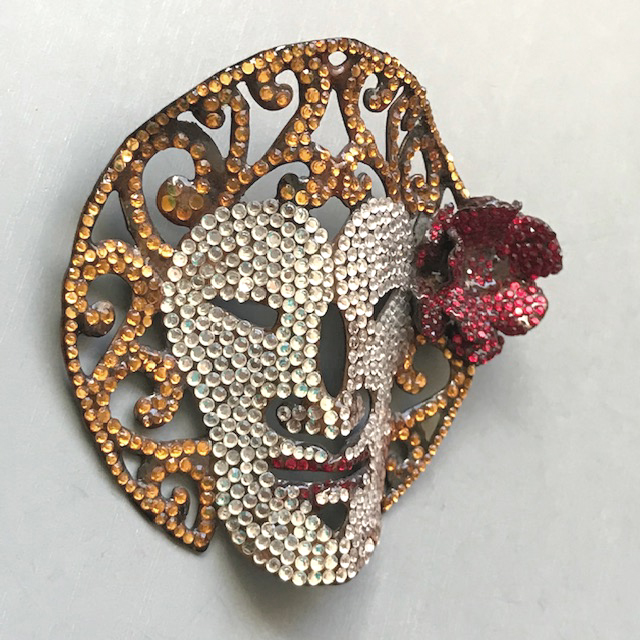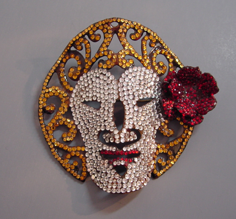 JOSEPH GOURDJI large enameled lady face pendant with clear, red and topaz colored rhinestones on antiqued copper backing circa 1995, a large brooch at 4"Product #65491 All items in excellent vintage condition unless otherwise noted.