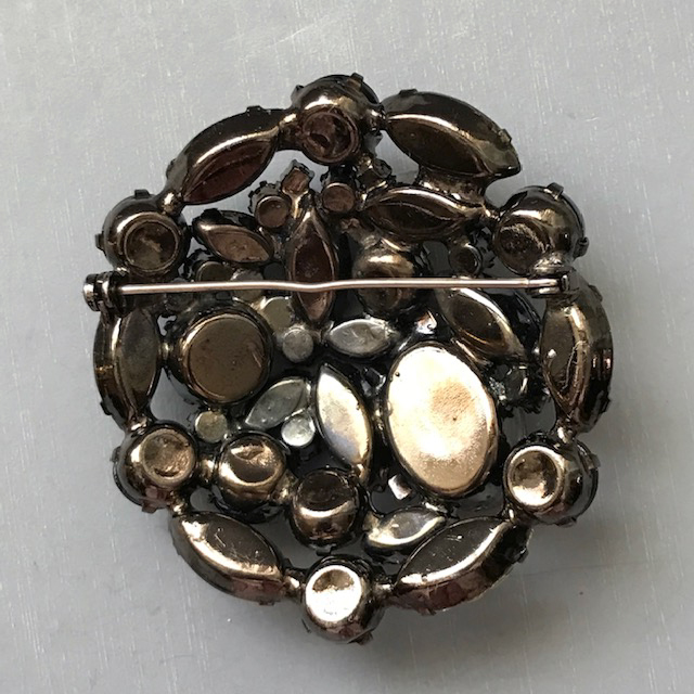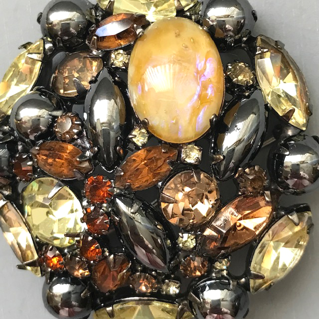 JULIANA brooch with an opalescent glass oval cabochon, dark gray rhinestones that are the color of hematite, yellow and caramel colored rhinestonesProduct #41802 All items in excellent vintage condition unless otherwise noted.