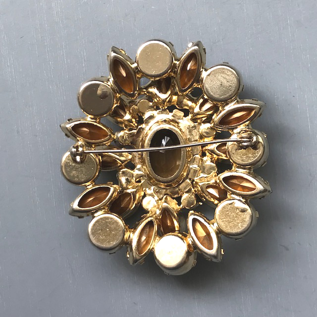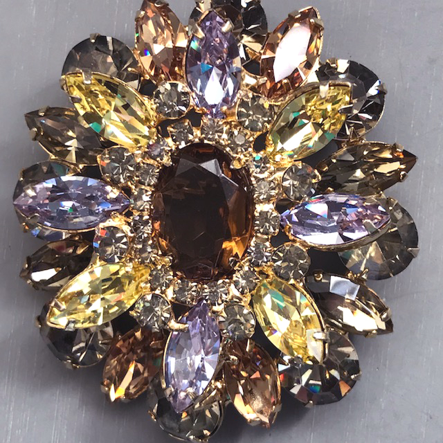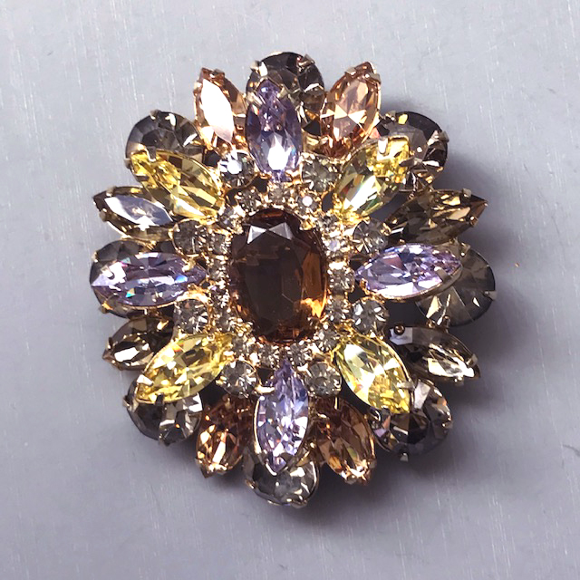 DescriptionJULIANA D&E lavender, gray and yellow rhinestones brooch in a gold tone setting, 2-1/3" by 2-1/8". Circa 1960, this is a lovely combination of colors.