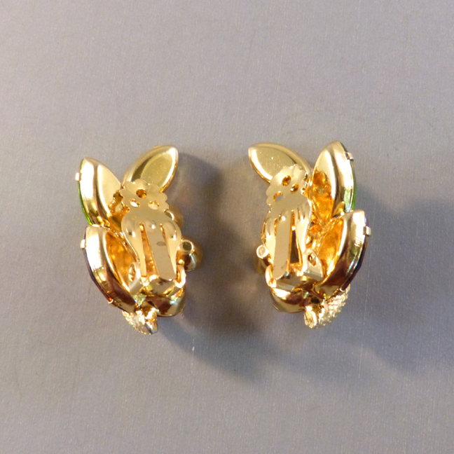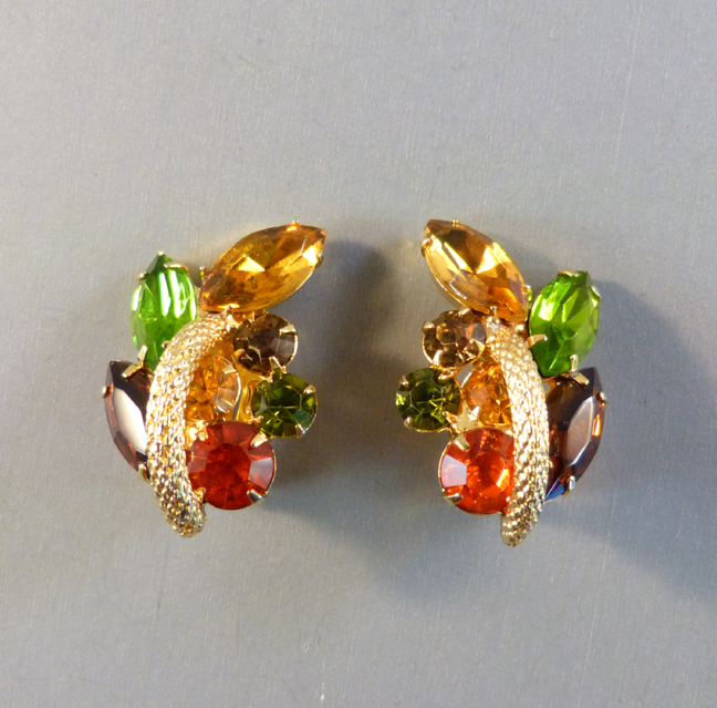 DescriptionJULIANA D&E style earrings with beautiful green, brown orange and topaz colored rhinestones set in gold tone.