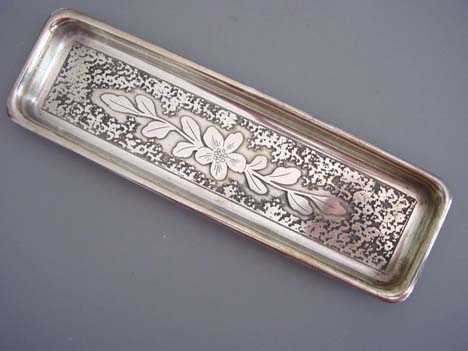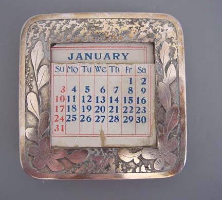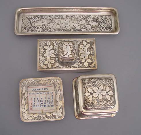 Description ARTS & CRAFTS silver plated desk with foliate designs, set marked with a "KO & Co" in an oval. The set includes a perpetual calendar 3"; rocker ink blotter 4"; pen tray 7-7/8" by 2-1/3"; inkwell 3" by 2-1/3". KO& Co is Kronheimer Oldenbusch Co, New York, NY 1900-1922 as listed in Schiffer's "Silver Encyclopedia". I saw on line that the company closed in 1949 so this set would have been made earlier. View View View View View View View Product #a32868