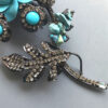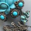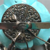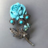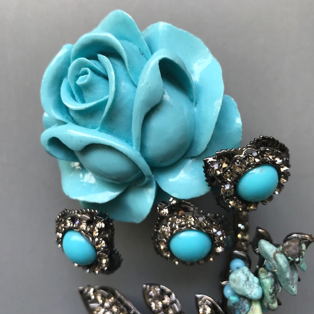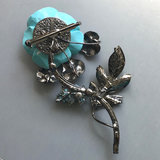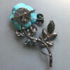 LARRY VRBA aqua rose flower brooch with aqua cabochons in a clear rhinestone haloProduct #42784 All items in excellent vintage condition unless otherwise noted.
