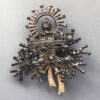 The candle is made of pink rhinestones, the flame is a golden color teardrop rhinestone, and the greens and berries are green and red rhinestones.  The halo around the flame is made of clear rhinestones, very brilliant, and the bow at the bottom is also made of clears.  The entire piece is three-dimensional it is 5" by 4-1/8".  This is signed on the back "Lawrence Vrba" and it was made in 2025.