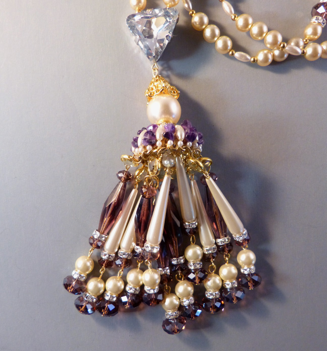 Description LAWRENCE VRBA long tassel necklace with purple glass beads, glass pearls and clear rhinestones, chain 30" and the tassel is an additional 5" long. It hangs beautifully and is in excellent condition, having never been worn. Larry Vrba does these so well, and they are such fun to wear.