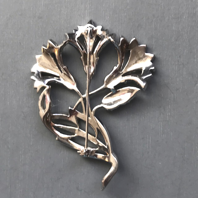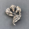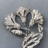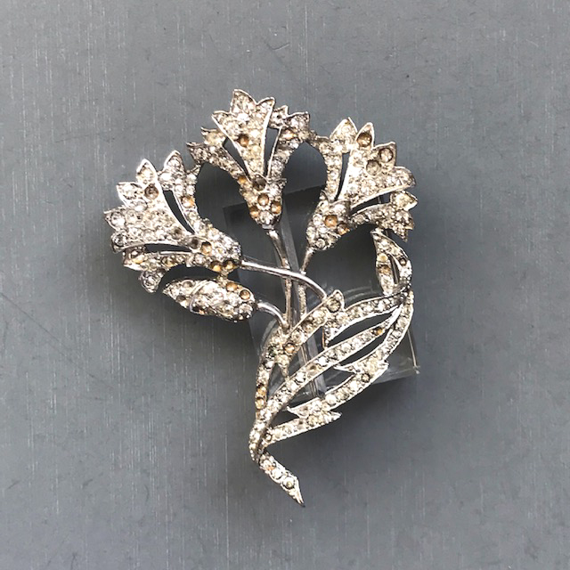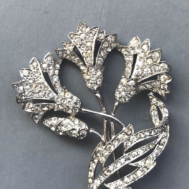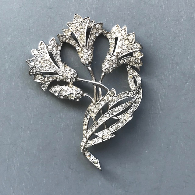 LOTUS flowers bouquet brooch with brilliant clear rhinestones, three flowers and a pierced leaf, not a gray stoneProduct #42668 All items in excellent vintage condition unless otherwise noted.