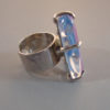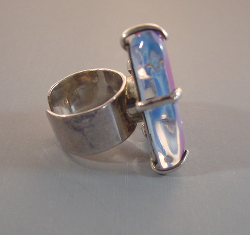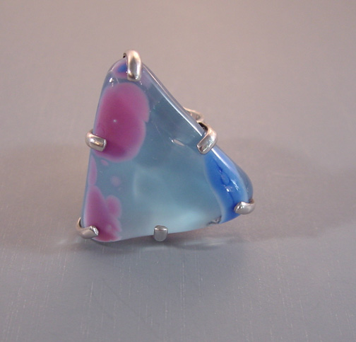 MARIQUITA MASTERSON unsigned poured glass triangular ringLovely colors and translucency! This ring was made at the beginning of Masterson's work circa 1984 and has been identified by them as such . Masterson started her jewelry line in Houston in 1984, where it is still made today. The jewelry is set in sterling silver, and each piece is hand cut and set with Pate de Verre, slumped or dripped glass so that no two are exactly alike. She often uses recycled bottles, which are melted and made into this wonderful, collectible and very wearable jewelry.This is in excellent condition. View View Product #X36528 All items in excellent vintage condition unless otherwise noted.