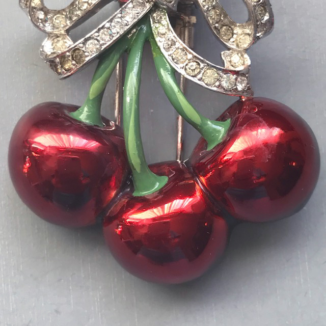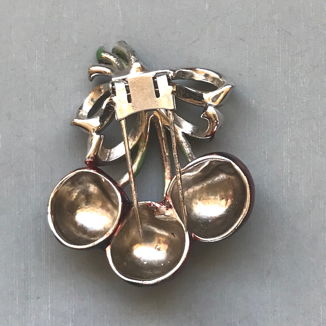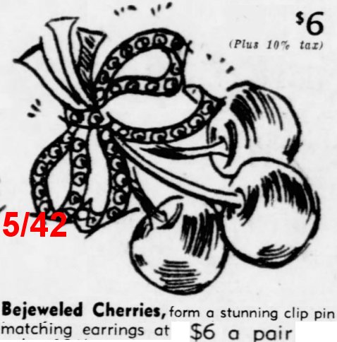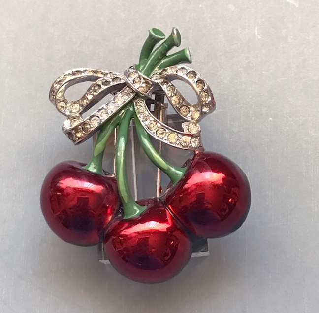 Description MAZER attributed red and green enameled cherry fur clip of rhodium plated base metal and clear rhinestones, 2-1/4" by 1-3/4", not signed. It does have the number "14" on the back of one cherry. The colors on this are rich and dramatic and it almost looks good enough to eat! It is from the early 1940s, like so much marvelous vintage jewelry. NOTE: The last photo is an ad for this clip, dating it 1942. View View View View Product #42630